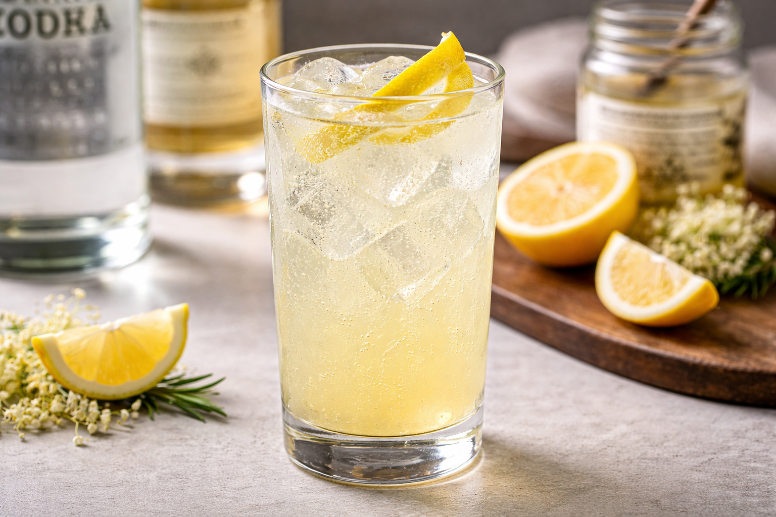 - Versez la vodka, la liqueur de fleur de sureau et le jus de citron dans un verre rempli de glace.